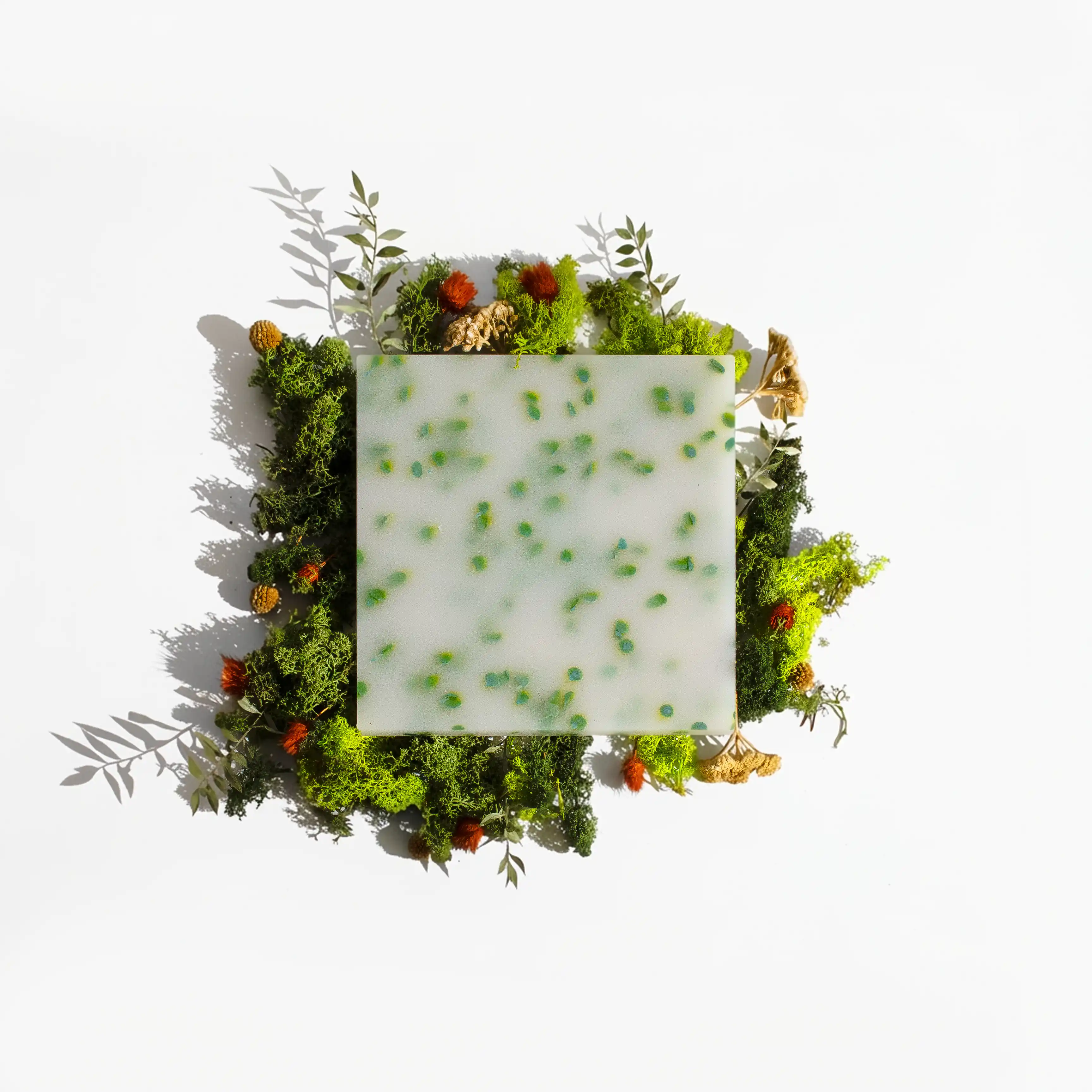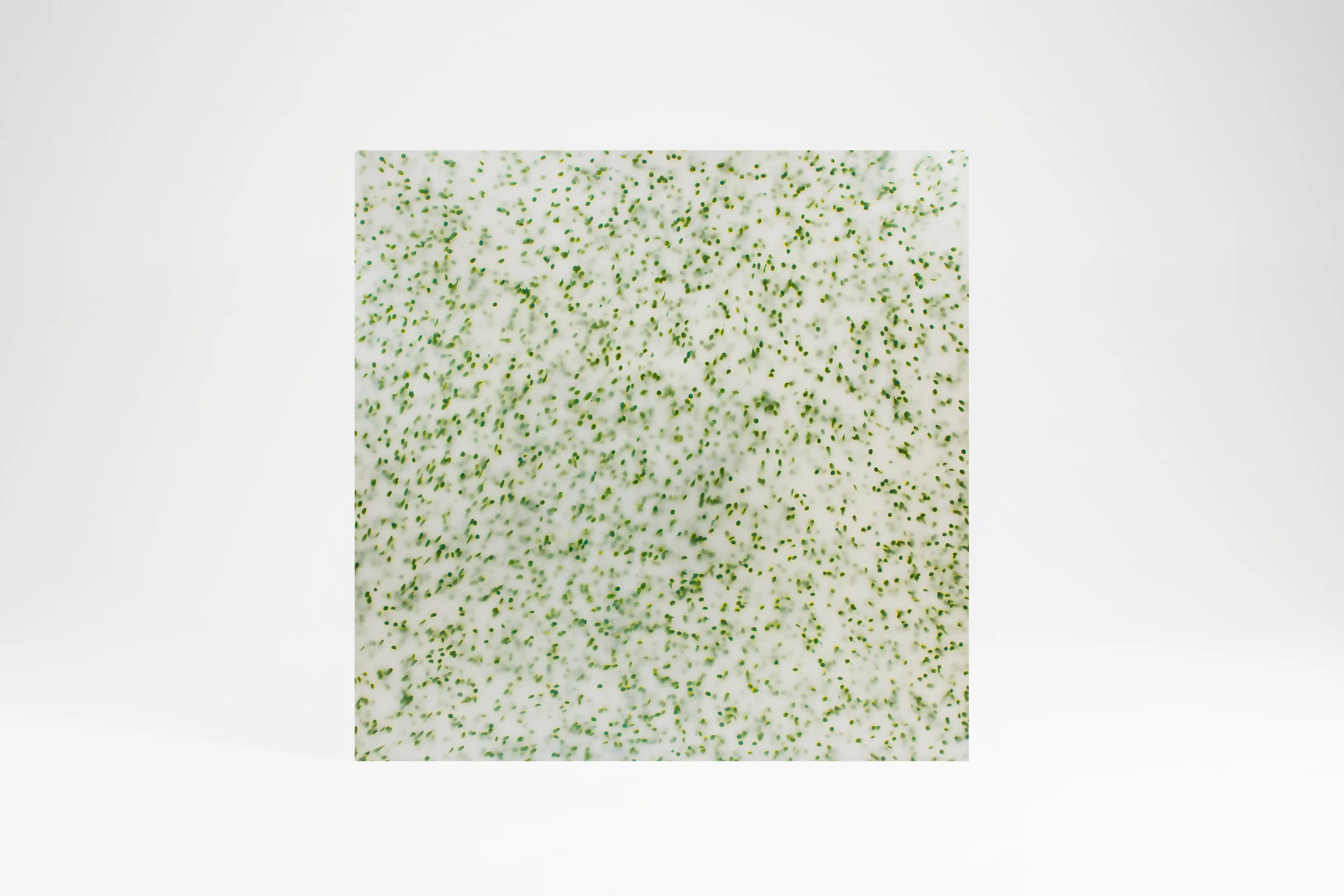 Yumuşak yeşil tonların yarı saydam zeminde dağılmasıyla doğal ve sakin bir ışık etkisi oluşturur. Mekânlara hafiflik kazandıran şeffaf yüzey çözümü.