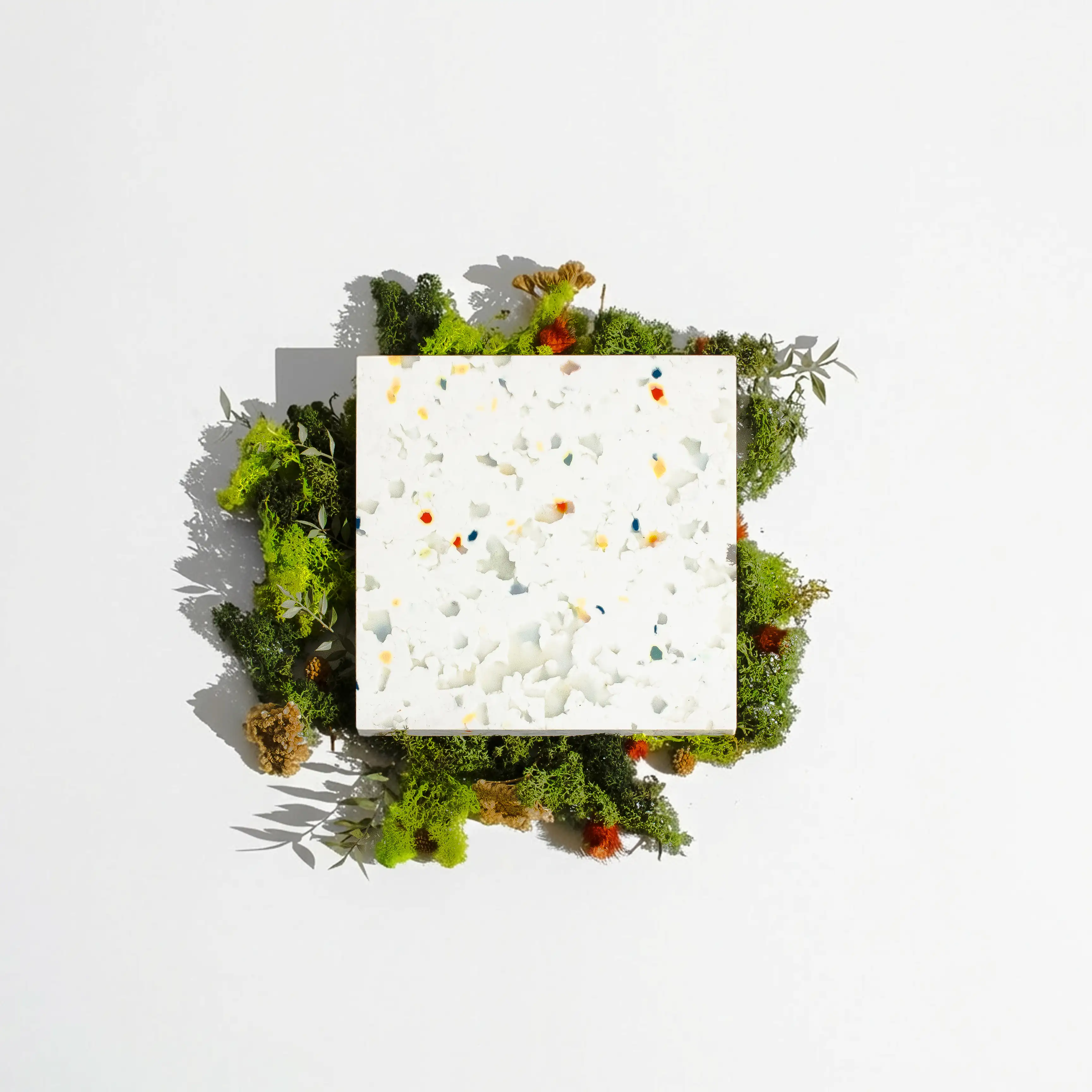 Karma, Chalk’un sade beyaz zeminini korurken içine serpiştirilmiş renkli parçacıklarla daha canlı bir karakter kazanır. Konfeti gibi dağılan bu küçük renk dokuları, her paneli benzersiz ve hareketli bir yüzeye dönüştürür.