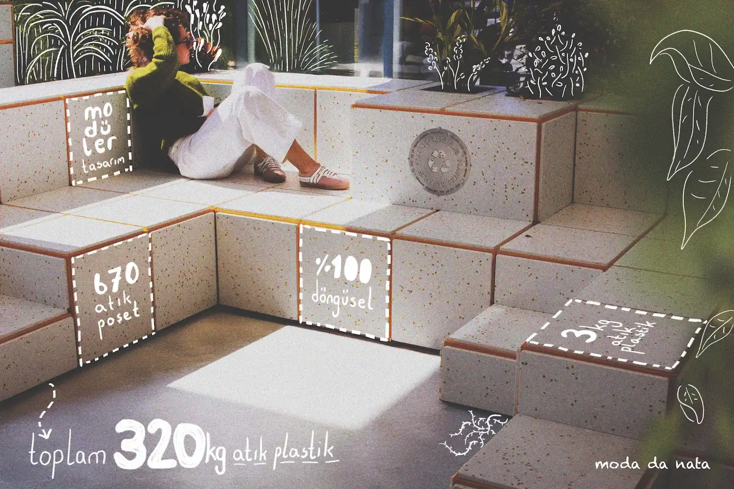 Her proje, geri dönüştürülmüş plastik malzemenin farklı ölçeklerde ve kullanım alanlarında nasıl değerlendirilebileceğini gösterir.