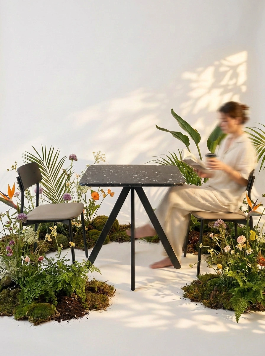 Square Table, Blai ve TEMPO işbirliğinden doğan flatpack mobilya koleksiyonu Good Stuff'ın parçası. %100 geri dönüştürülmüş plastikten üretilmiş Blai Panel tabla, TEMPO'nun toz boyalı çelik flatpack ayağıyla buluşuyor. Ev, stüdyo ve kafeler için.